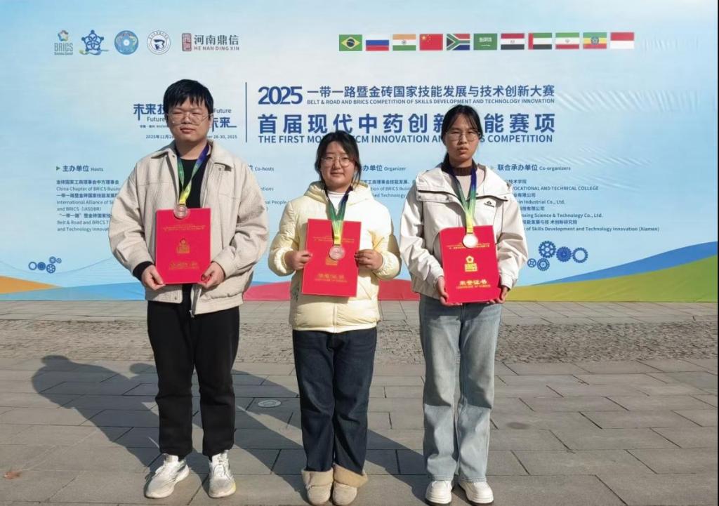 近日,2025“一带一路”暨金砖国家技能发展与技术创新大赛“现代中药创新技能赛项”在亳州职业技术学院圆满落幕。我校指导教师李雪倩、牛学义和2024级中药班徐钰炜、赵雅涵、赵依蕊三位同学组成的参赛团队,历经初赛选拔与现场决赛的双重竞技考验,在全国90余支精英队伍的激烈比拼中脱颖而出,凭借扎实的专业功底和出色的实操能力,荣获大赛三等奖(铜奖)。